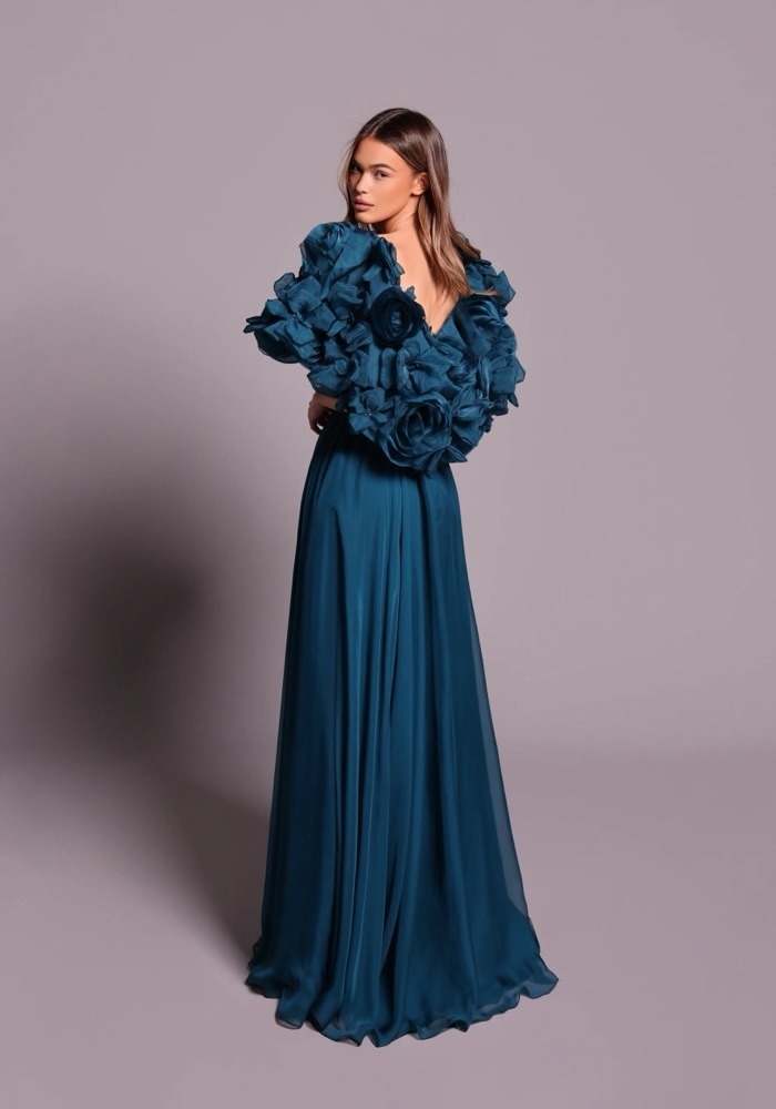 Sweetheart neckline evening gown with a beautifully draped bodice, featuring dimensional ruffled sleeves made of floral.